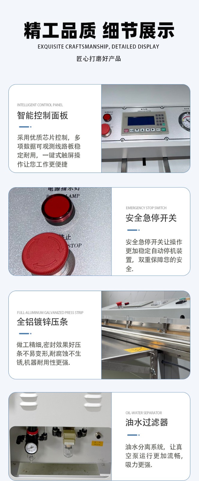 - 功能匹配:根據核心需求選擇集成功能,例如食品行業優先選 “真空 + 充氣 + 印字” 款,工業領域可側重 “真空 + 寬邊封口” 款。